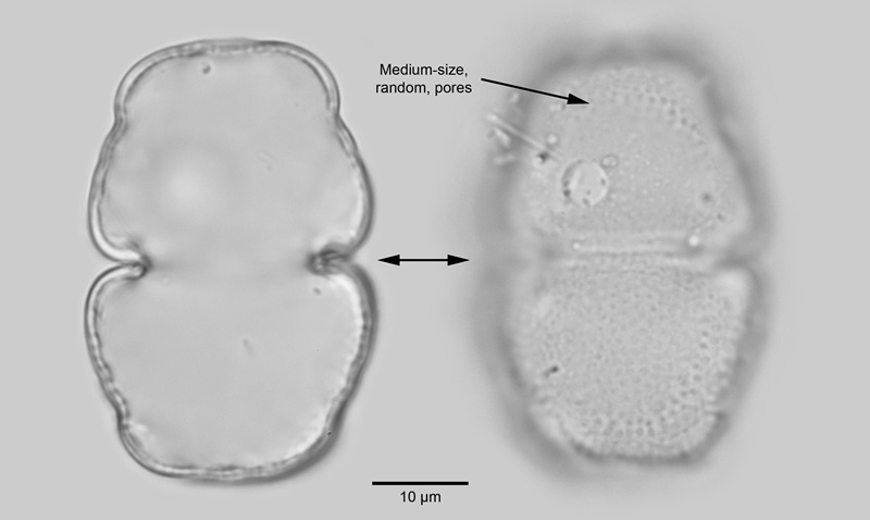 Until recently this was a variety of Cosmarium holmiense. Semicells subtrapeziform with broadly rounded basal and apical angles and a well-marked constriction just below the apex, sides slightly convex with up to two undulations, apex broadly rounded. Cell-wall smooth with small to medium pores. Chloroplast axile with usually ten longitudinal ridges, seen best in apical view, and one pyrenoid. It differs from C. holmiense in having up to two undulations below the apical constriction as apposed to four and is much commoner.