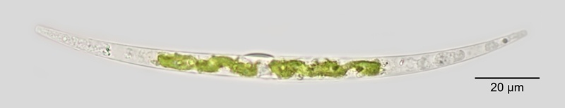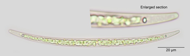 Cell dimensions: L. 100-158 µm; B. 7.3-11.2 µm; Ap: 2.0-3.4 µm; L/B: 10-20.