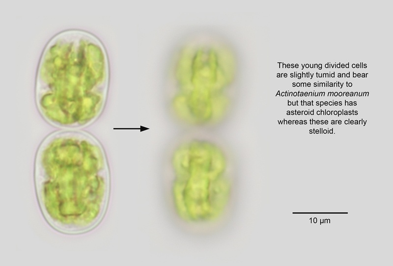 A small species with a slight, but obvious, median constriction. The chloroplast is stelloid with usually eight strands as seen in apical view with one pyrenoid per semicell.