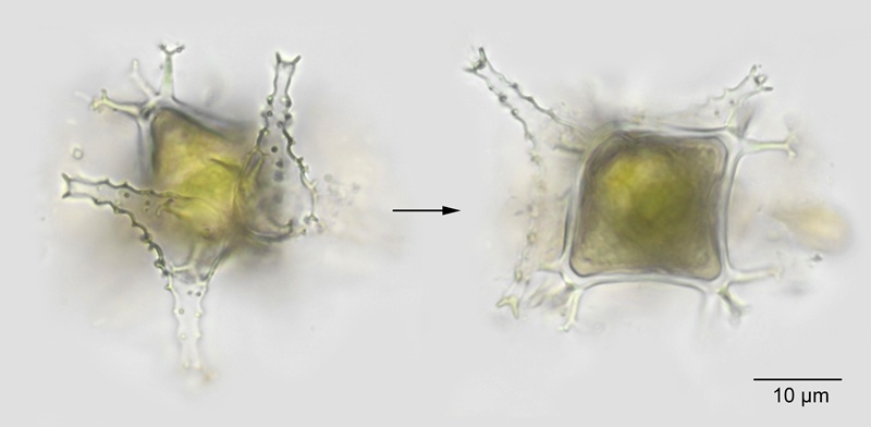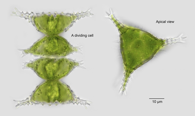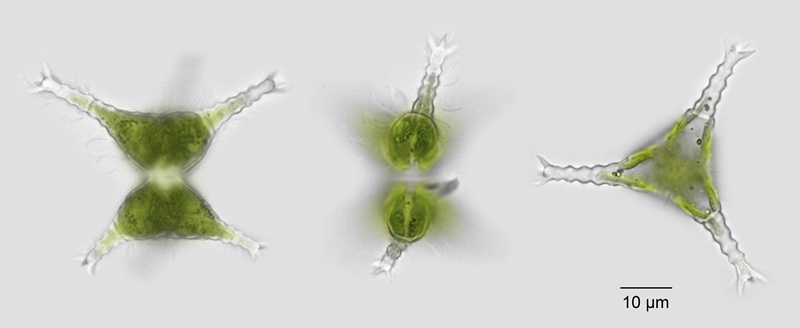 Similar to St. gracile, but stockier and with more robust terminal spines. Found with tri-radiate and quadri-radiate forms, the latter being commonest and is stockier, presenting a different L/B ratio. The zygospores are multifaceted, presenting 4–6 angles in face view. The projections have furcate apices.