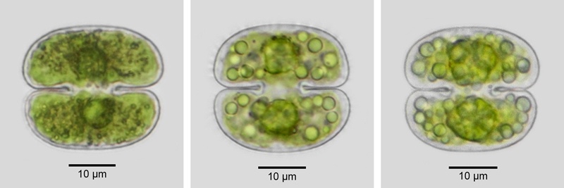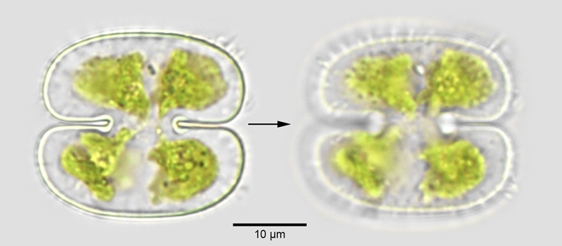A small cell with the sinuses closed for the most part, basal angle rounded, sides convex and converging, blending smoothly with the slightly convex apex. Chloroplast axile with one pyrenoid, (reports of two pyrenoids per semicell seem highly unlikely).