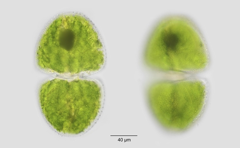 A distinct and large cell that cannot be confused with any other. The semicells are ovate with a broad base with the sides in face-view furnished with about 20 medium-sized conical granules. Unusually, the chloroplast is parietal.