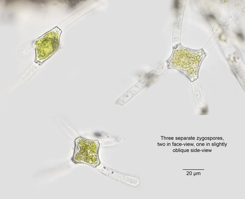 First described by Kützing as Staurospermum viride but that genus does not appear to have been designated. It was moved to Mougeotia by Wittrock (1872: 39). John et al. (2011: 586) record it as cosmopolitan and one of the most abundant Mougeotia species in the British Isles. The zygospore is quadrate with concave sides.