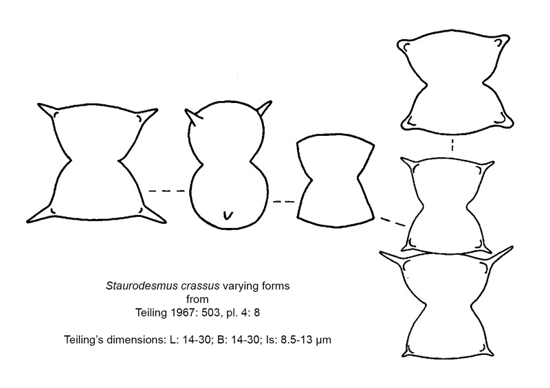 A small cell with wide-open sinuses from an angular or rounded base. Semicells sub-cuneate with a convex, or occasionally, truncate apex. Tiny spines occur at the apical angles pointing upwards. Cells are biradiate. Coesel & Meesters (2013: 20) made this a variety of the smaller Std. controversus even though they note there is no overlap in cell dimensions. West & West (1912: 102), as Arthrodesmus crassus, also note a difference in the apical view: broadly elliptic-fusiform in var. crassus, broadly elliptic in the latter. I therefore prefer to follow Teiling (1967: 503) and keep them as separate taxa.