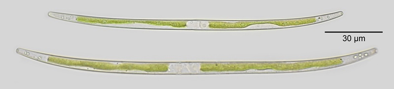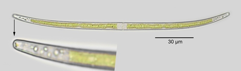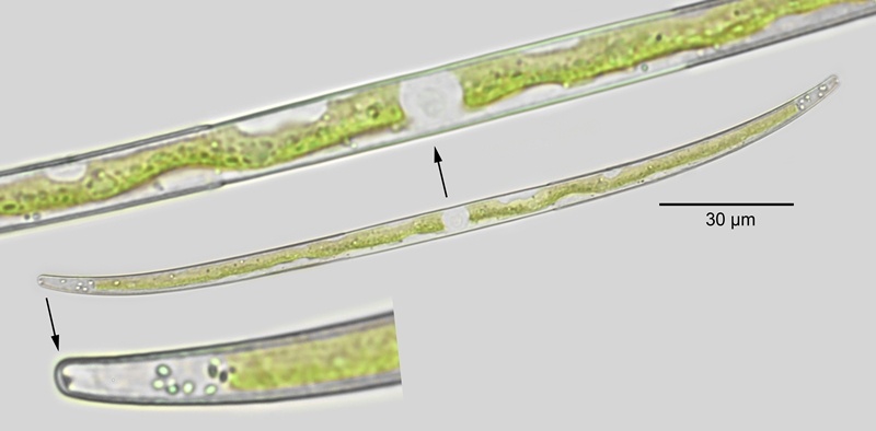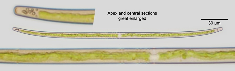 Cell dimensions: L: 149-190 µm; B: 5.7-6.6 µm; Ap: 2.3-2.9 µm; ApexB/CellB: 0.36-0.46; L/B: 26-30.