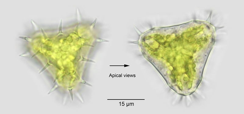 Cell dimensions: L: 36-39 µm; B: 33-39 µm; Is: 11-13 µm; Sp: 4-6 µm; Overall LxB: c.43 x 42; L/B minus spines: 1.0-1.04.