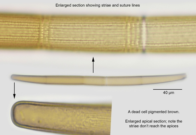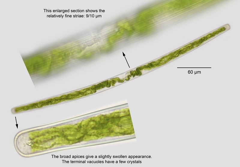 Cell dimensions: L: 200-425 µm; B: 13-18 µm; Ap: 7.7-10.6 µm; L/B: 18+.