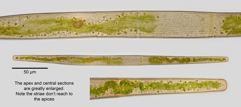 This cell has all the feature of Cl. subscoticum but differs in two noticeable ways: firstly it is slightly broader than the accepted upper limit of 12.5 µm, and secondly the end sections attenuate more sharply. It has all the usual features of Cl. subscoticum such as fine striae, truncate-rounded apices, which are slightly swollen (capitate), with a single crystal. It is probably just an aberrant form.