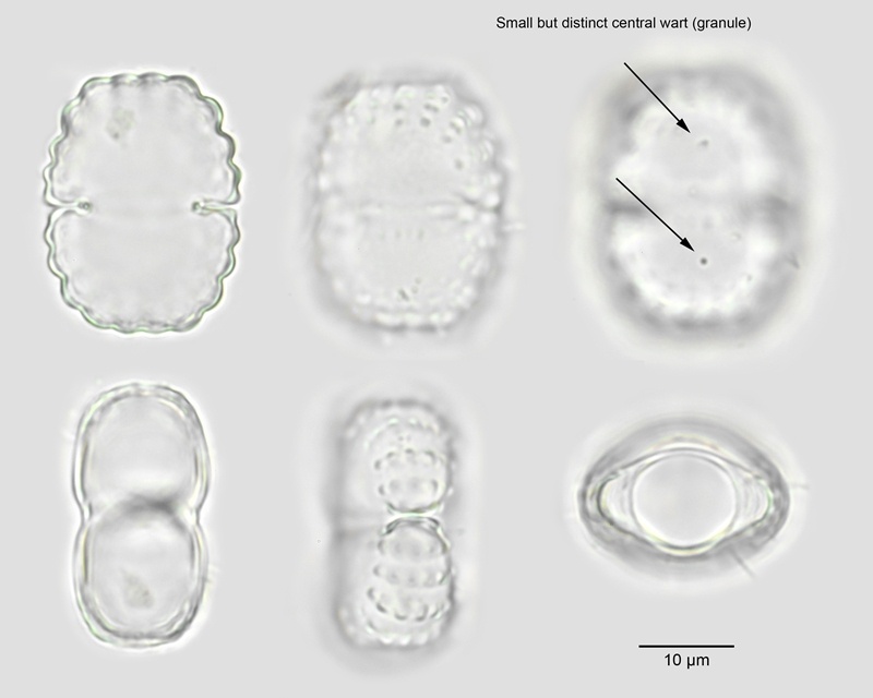 This recently described species needs to be carefully compared with C. cedercreutzii Grönblad 1921. That species is slightly larger with a higher L/B ratio, it also has a smooth central cell-wall unlike the present species that supports some flattened warts, but these can be difficult to see and can be reduced.