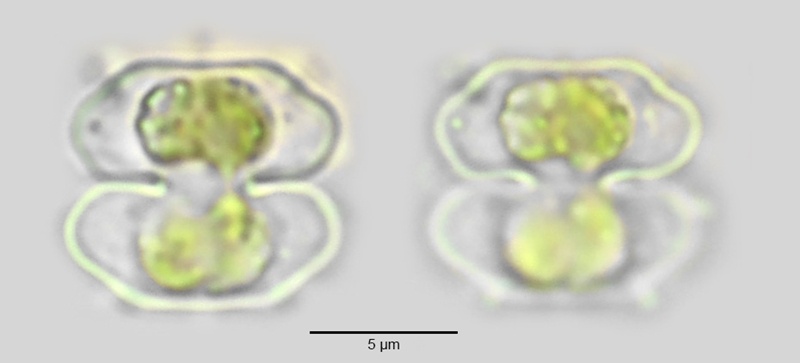 There are several confusingly small cells that display four granules in an asymmetric configuration. However, the granules can be faint or even lacking and difficult to see with a light microscope. With more research it may be possible to separate some of them on habitat preferences.