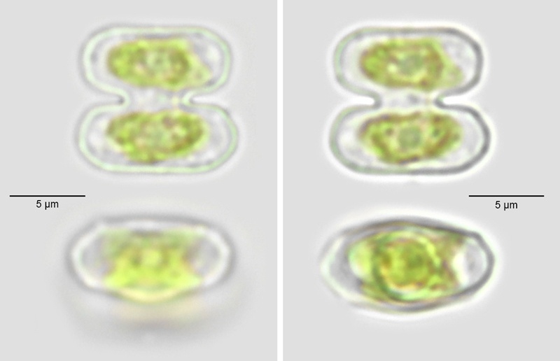 A very small cell with the sinuses V-shaped with a rounded apex. Semicells are rounded oblong-rectangular, lateral sides evenly rounded with small asymmetrical granule usually present, Apices truncate to slightly depressed. Chloroplast is axile with a single pyrenoid.