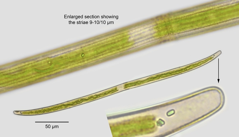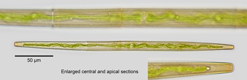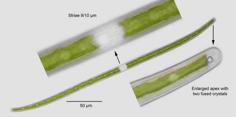 Cell dimensions: L: 200-444 µm; B: 8-11.6 µm; Ap: 4-6 µm; L/B: 20+.
