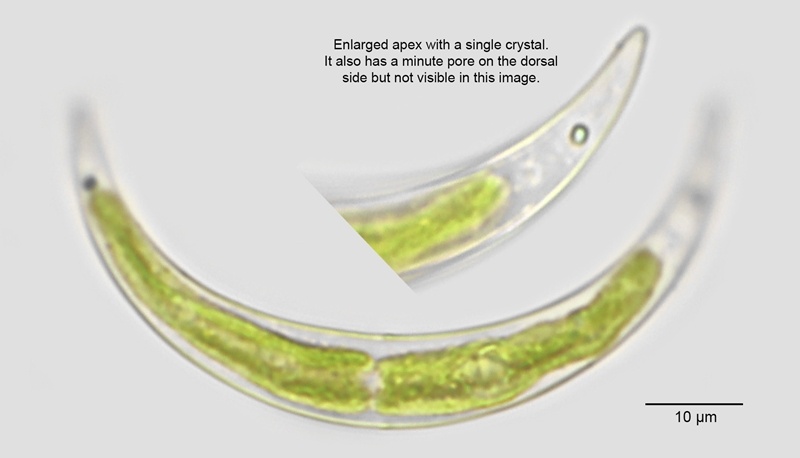 Closterium tumidulum is similar but slightly larger and with less curvature.