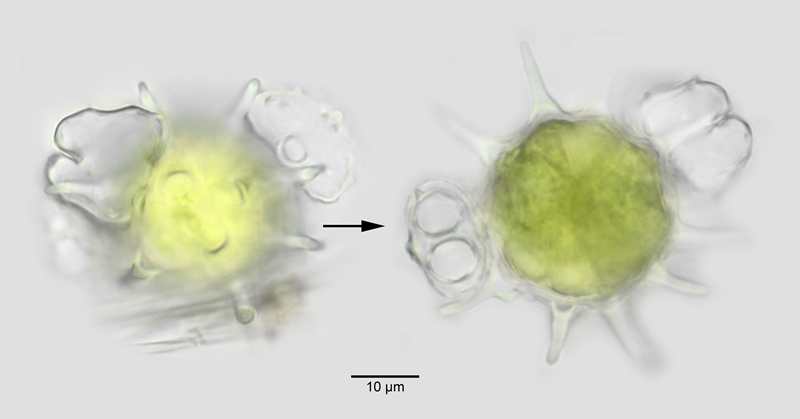 Zygospore globose with long, simple spines. Size minus spines: 25-28 µm; spines: 11-12 µm; overall: 47-53 µm.