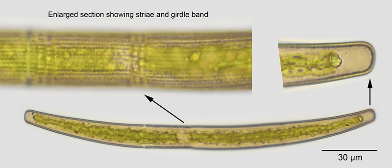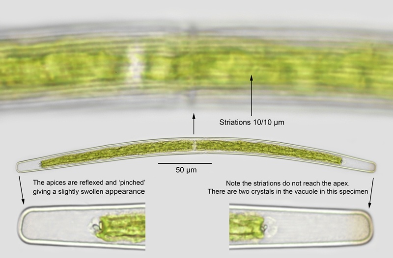 A variable species in several respects: it can be straight to cambered; the cell-wall can have medium noticeable striae, faint striae or seemingly lacking, even under high magnification; the apices can be truncate of reflexed. The terminal vacuole has a single crystal that can be compound. It can also present a considerable size range, partly due to dividing cells.