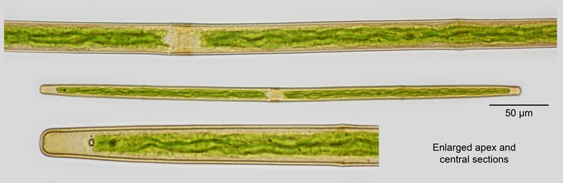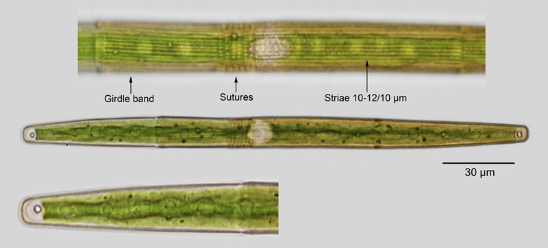 Cell dimensions: L: 188-410 µm; B: 12.8-17 µm; Ap: 7-11 µm; L/B: 14-32.