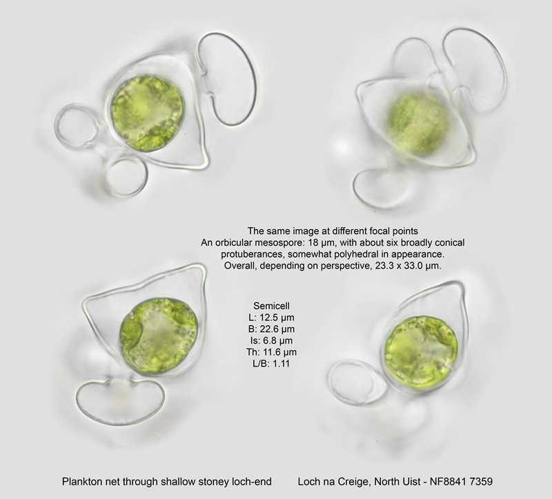 Most often found in acidic habitats but also occurs in circumneutral waters. It prefers the plankton and marginal vegetation of lochs. West & West (1905, p. 144) recorded it as unknown in Britain, which is surprising as it's frequently encountered in the Outer Hebrides. Zygospores are rarely encountered: one being found here in 2023. It was first recorded by Homfeld (1929, p. 47, pl. 6: 65).