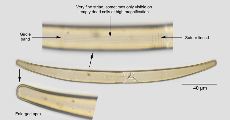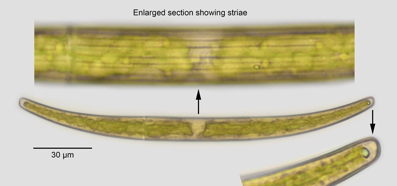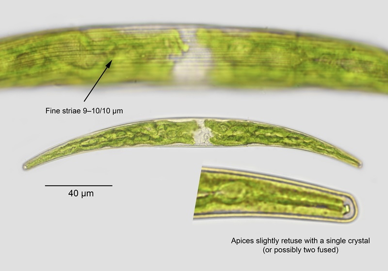 First described and illustrated by West (1892: 719, pl. 9: 1) from the Lake District, now Cumbria. It can be found with striae and, seemingly, without. Formae still exist that separate these taxa but, most likely, it's just a variable feature within the species. Similar to Closterium intermedium but that species is broader, almost without overlap.