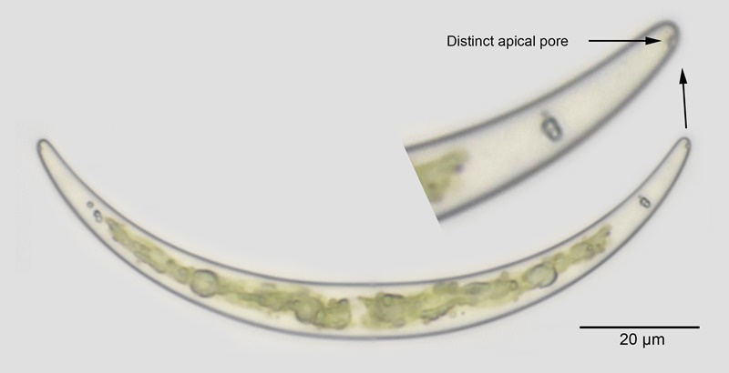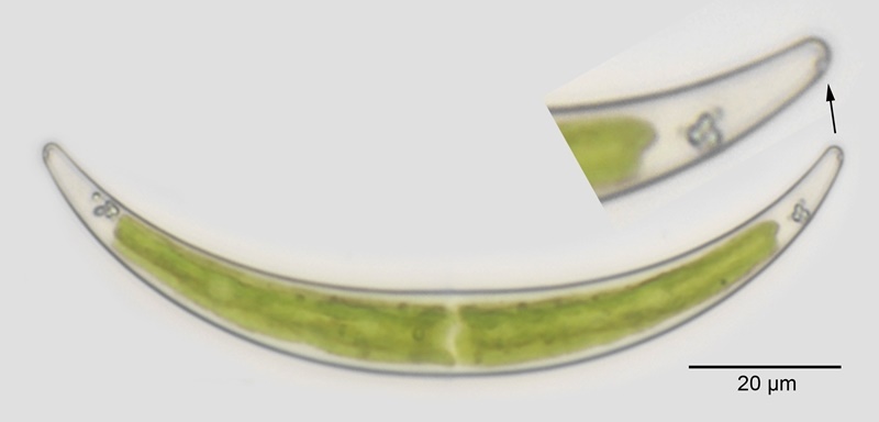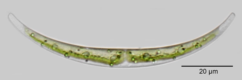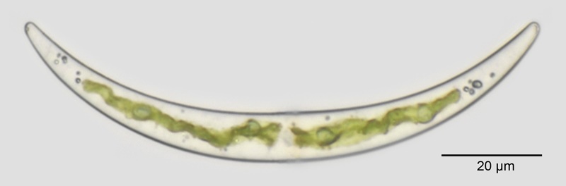 Cell dimensions: L: 92-114 µm; B: 7.7-11.4 µm; Ap: 2.3-2.5 µm; Arc: 102-122°; L/B: 9-12.