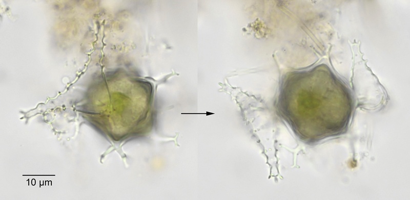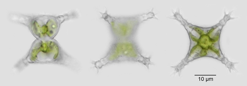Similar to St. gracile, but stockier and with more robust terminal spines. Found with tri-radiate and quadri-radiate forms, the latter being commonest and is stockier, presenting a different L/B ratio. The zygospores are multifaceted, presenting 4–6 angles in face view. The projections have furcate apices.