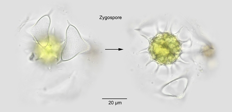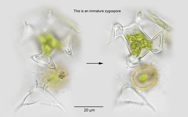 Zygospore: minus projections: 26-28 µm; overall: 42-44 µm.