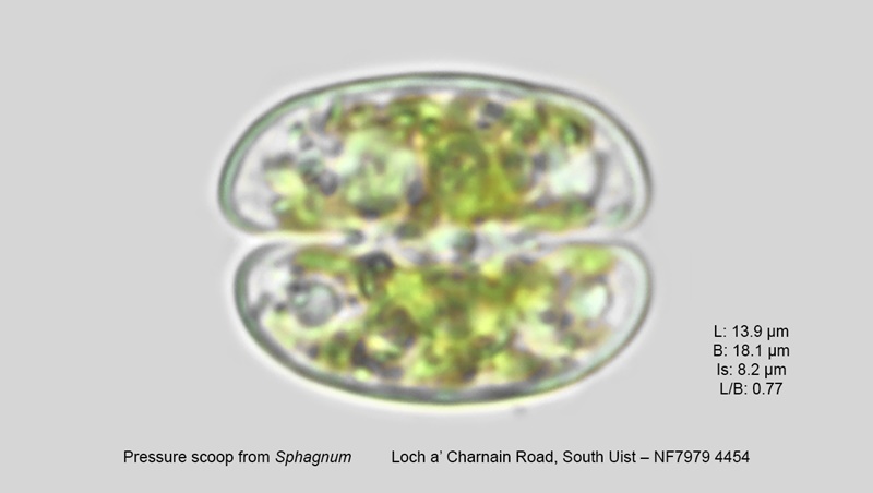 More frequent than the nominate variety but still not often encountered. It's interesting that the nominate variety has two pyrenoids per semi-cell whereas this variety has one. Coesel & Meesters (2007) record it as 'var. minor'