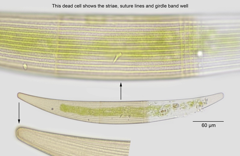 Cell dimensions: L: 270-410 µm; B: 30-45 µm; Ap: 8.5-12 µm; L/B: 8-10.