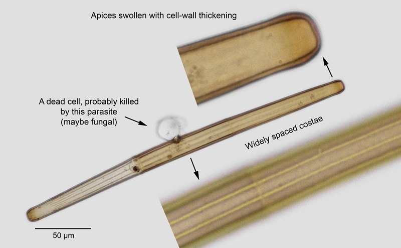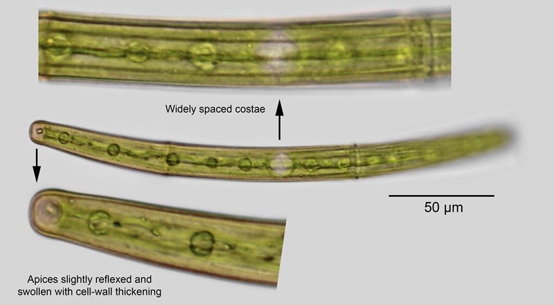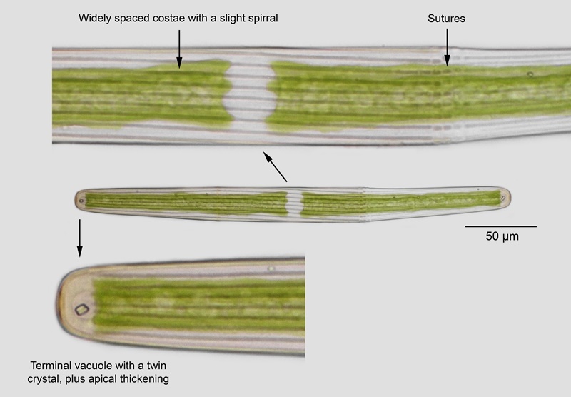Cell dimensions: L: 280-400 µm; B: 17-28 µm; Ap: 10-15 µm; L/B: 12-20.
