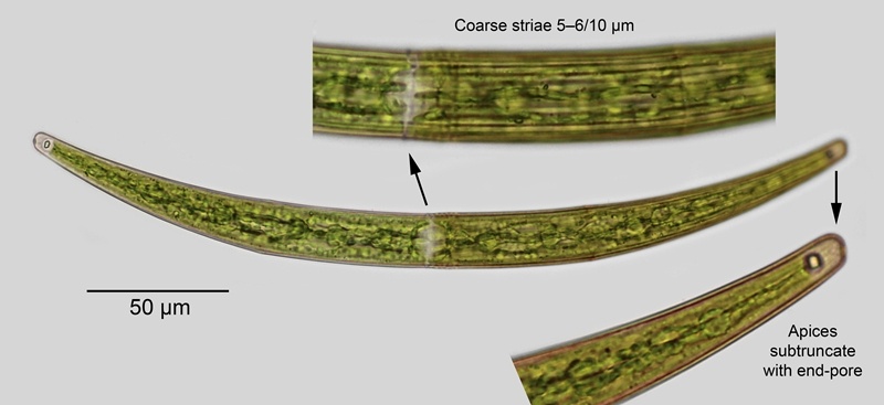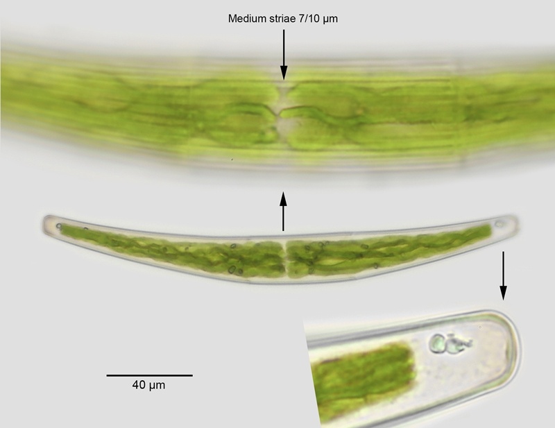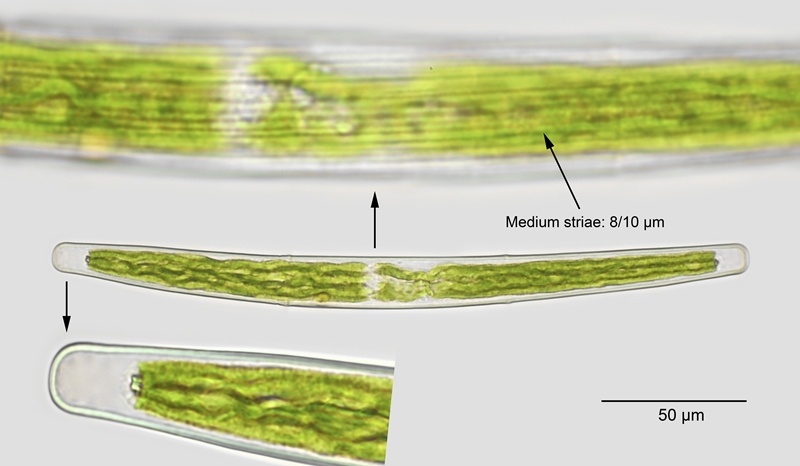 Cell dimensions: L: 220-330 µm; B: 19.5-29 µm; Ap: 6-11 µm; L/B: 8-17.