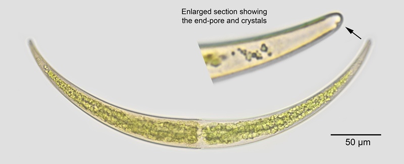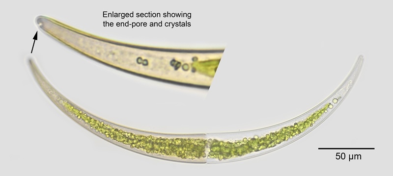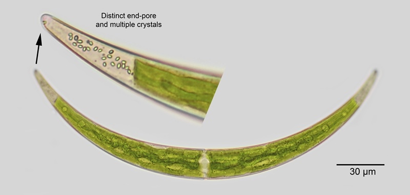 Cell dimensions: L: 195-325 µm; B: 15-28.5 µm; Ap: 3.2-4.3 µm; Arc: 122-132°; L/B: 11-13.