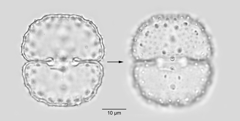 Cell dimensions: L: 31-38 µm; B: 27-34 µm; Is: 8-11 µm; Th: 17.5-21 µm; L/B: 1.07-1.15.