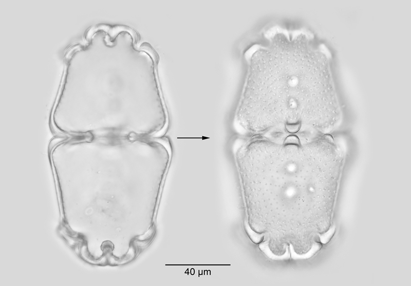 Cells are frequently found with the laterals supporting additional median rounded protuberances. These protuberances are erratic: occasionally showing on one side of a cell or just on one semicell. This feature has long been observed: Harris (1928, No.14: 8, pl. 5: 2) suggested it should be made a variety but it was never validly published. This was at a time when any slight variation was deemed suitable for varietal of forma status. The feature described here is found in mixed populations with cells not displaying the feature.