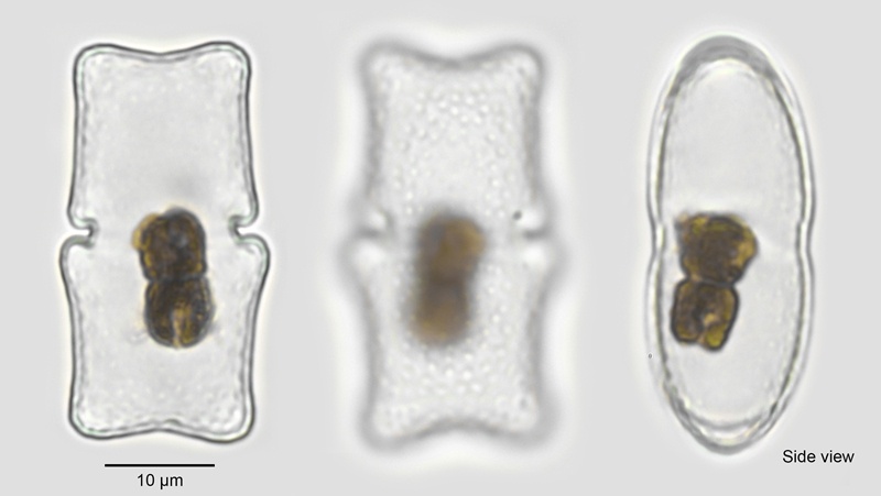 A distinct shape, which is almost twice as long as broad. It needs to be compared with the very similar Cosmarium tatricum Raciborski 1885. That latter species tends to have a narrower apex in relation to the breadth of the semicells’ base. It also has a lower L/B ratio, but there is overlap. Intermediates exist which are difficult to determine.