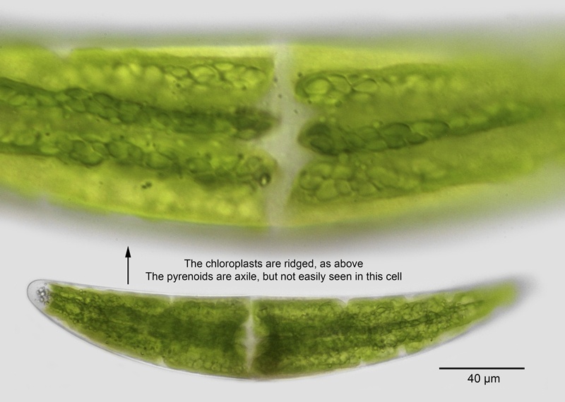 Cell dimensions: L: 200-290 µm; B: 35-50 µm; Ap: 6-11 µm; Arc: 82-125°; L/B: 5-7.