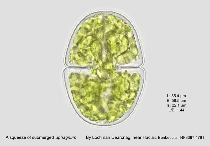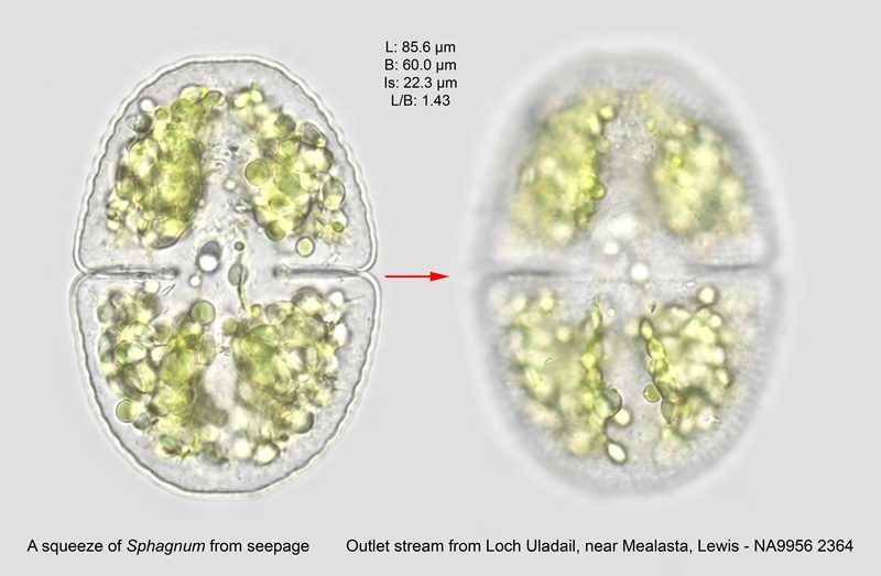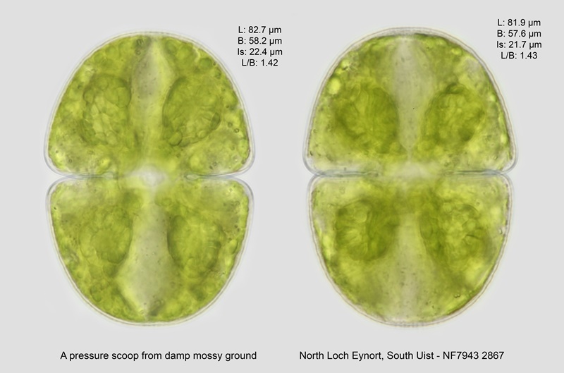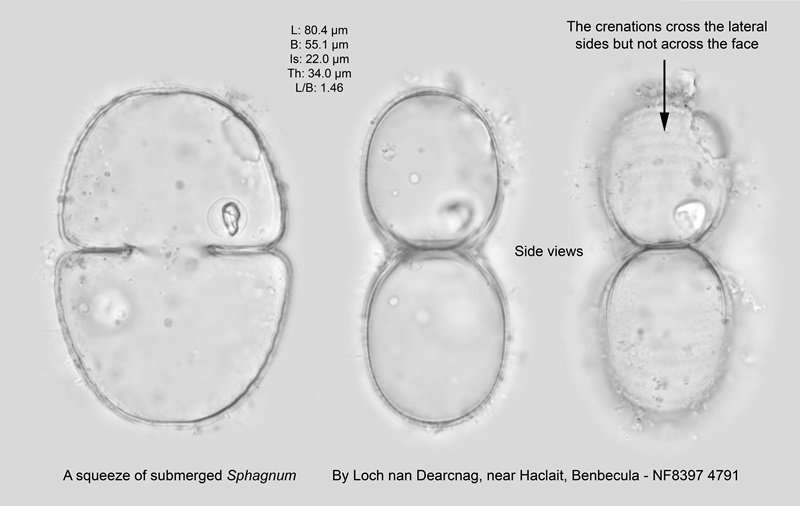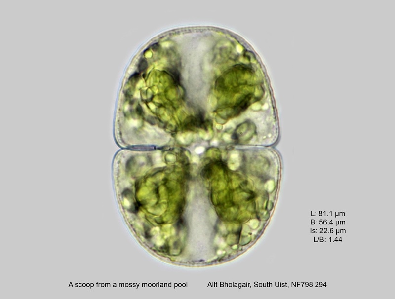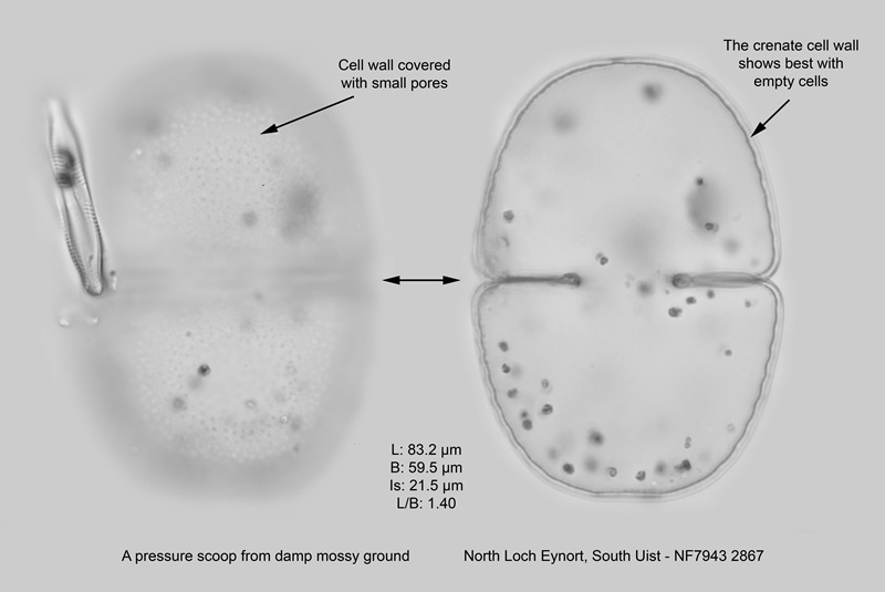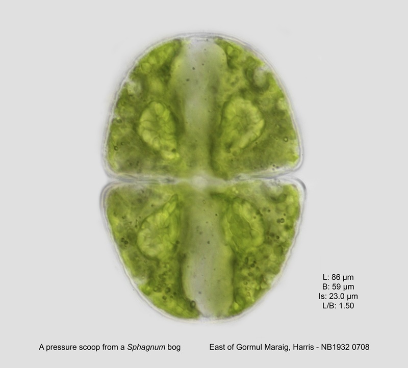A rare desmid found in Ireland and the Outer Hebrides. More finds are needed to get a better geographical perspective but the Atlantic north-west would appear to be its stronghold. A main characteristic is the crenate lateral sides as seen in face-view: these traverse the sides. Found in moorland peaty pools and quaking Sphagnum bogs.