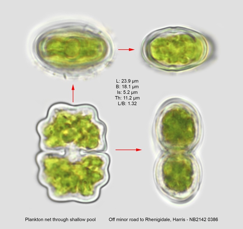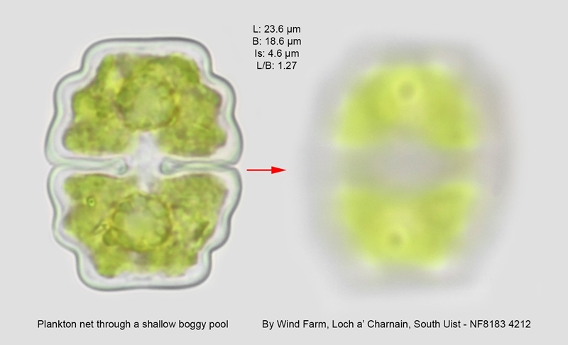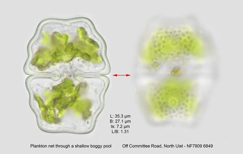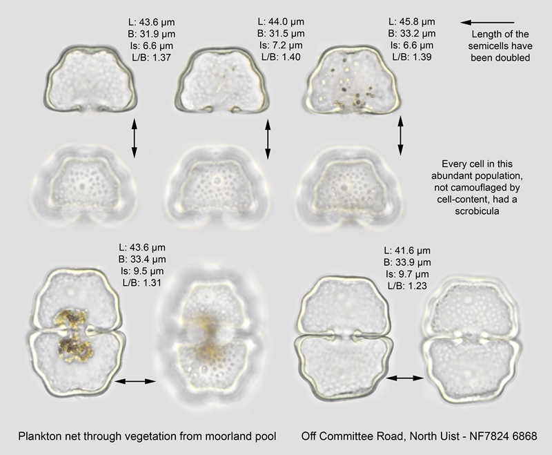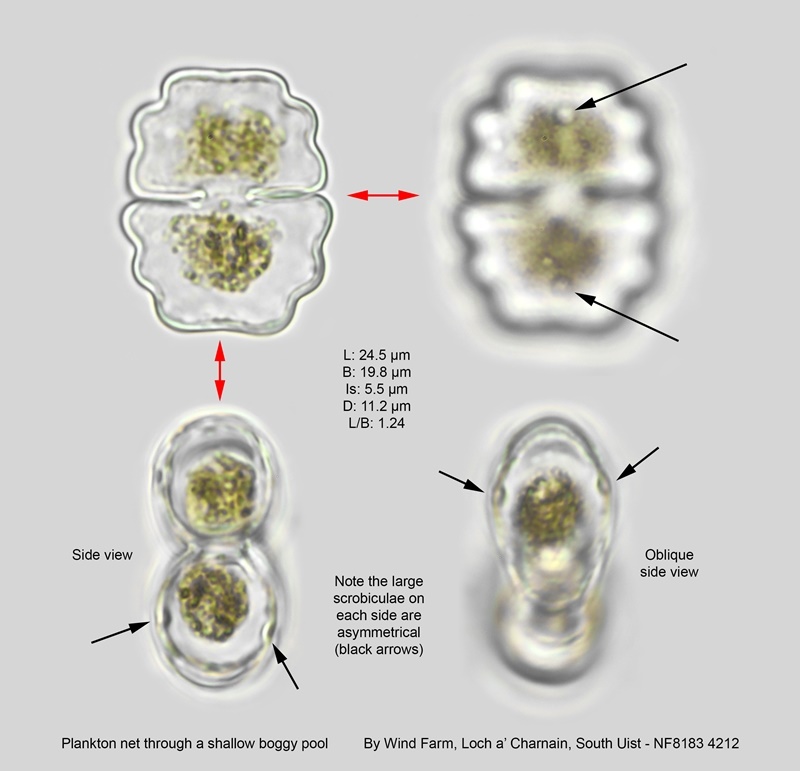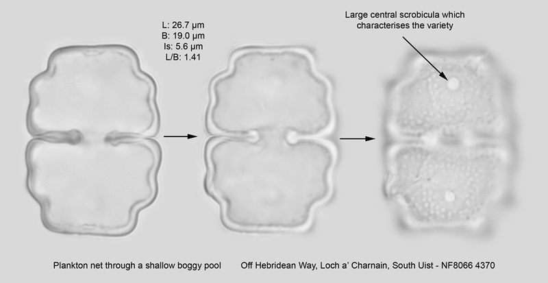 Of common occurrence in acidic pools and bogs. The distinguishing characteristic is the large scrobicula approximating to the centre of the semicell (see more details on the images). There is some doubt as to whether this variety is justified as most cells seem to have the scrobiculae. Where they are supposedly missing might be camouflages by the chloroplasts or naturally faint or missing in some cells. There is a large size-range within this species with cells from the Outer Hebrides currently L x B: 23.6–45.8 x 18.6–33.7 µm.