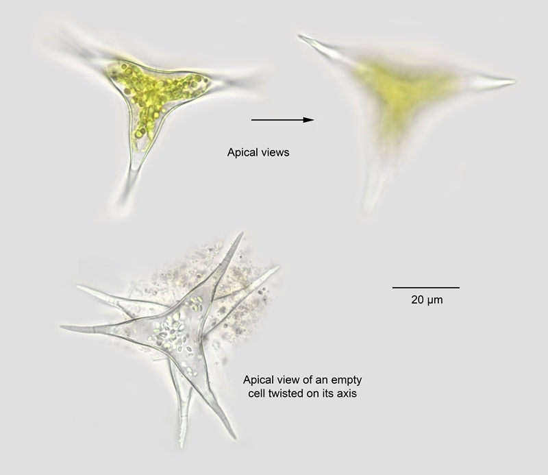 West, West & Carter (1923), as Staurastrum curvatum, note “… is most commonly found in the western part of the British Isles, and is frequent in the plankton …”. More sampling is required for the Outer Hebrides, but it would seem to be much scarcer now. Found in slightly acidic lochs with open water.