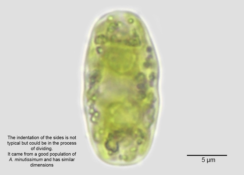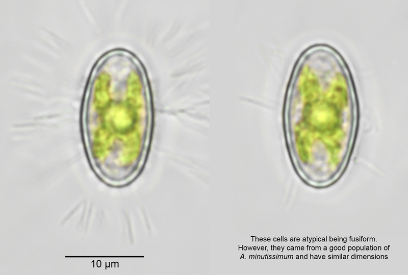 Nordstedt (1873: 46, pl. 1: 21) first described the species as Penium minutissimum, later moved by Teiling (1954: 408) to Actinotaenium. Cells almost cylindrical, slightly tumid with a hint of a sinus. This species is very similar to A. mooreanum but the cells of this latter species are slightly larger and taper more rapidly towards the apices. Most reports give A. mooreanum as tumid (close to barrel-shaped); a useful distinction. However, A. minutissimum can exhibit tumidity to a lesser extent. Both species can exhibit one or two pyrenoids per cell.