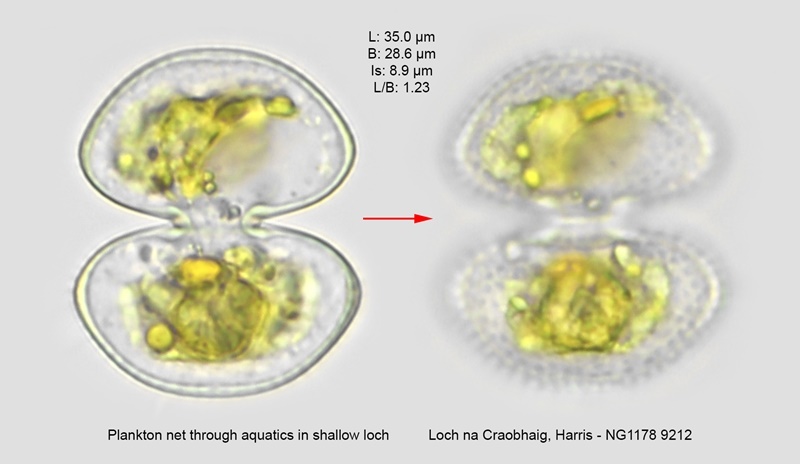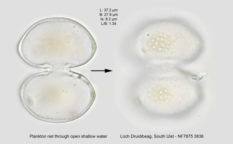 A rare species found in oligotrophic waters such as shallow lochans and moorland bogs. The sinus is shallowly open at the apex, becoming wide open. The rounded lateral angles exhibit some wall-thickening. The relatively thick wall of the cell has a series of pores.