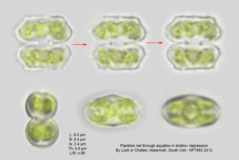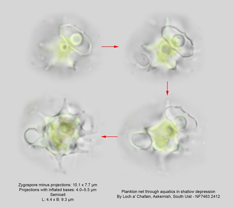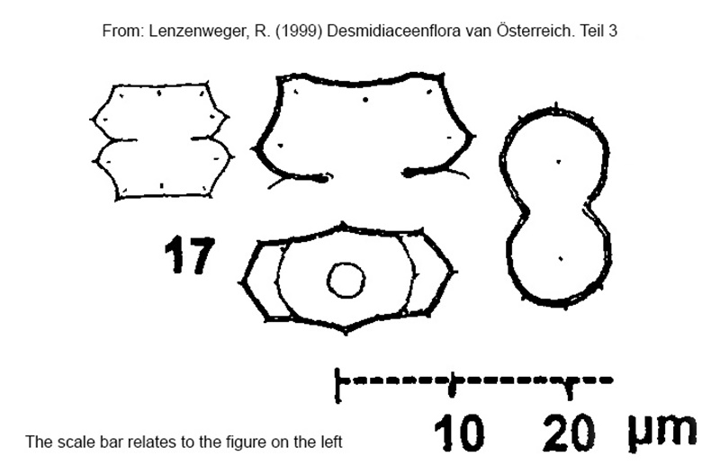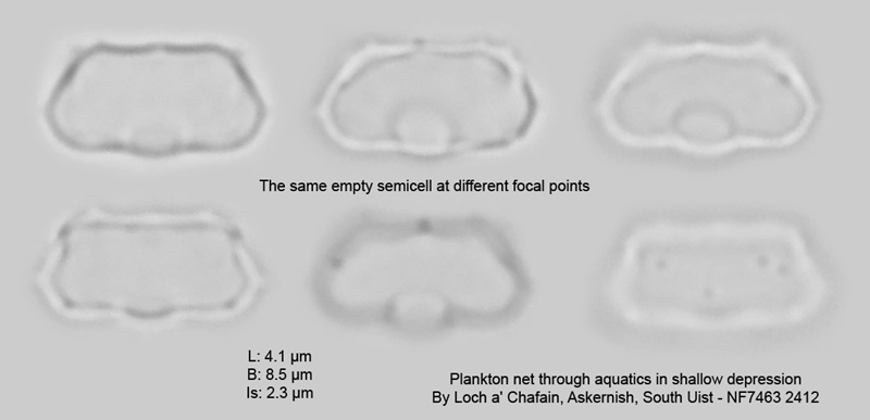 A rare desmid found in the tychoplankton of shallow pools and lochans. Only known from two localities in Europe, it differs from the nominate in having more numerous granules at the marginal poles and a central granule at the apex. There is also a granule in the semicell's centre which is clearly seen in apical view. The zygospore found at Askernish is the first recorded.