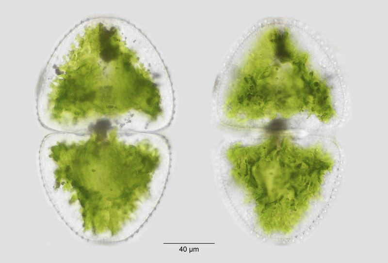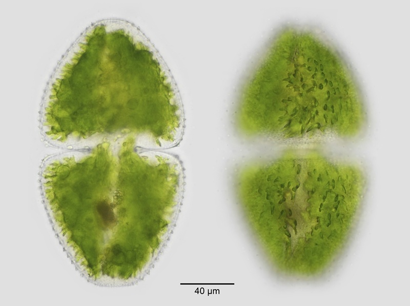 A distinct and large cell that cannot be confused with any other. The semicells are ovate with a broad base with the sides in face-view furnished with about 20 medium-sized conical granules. Unusually, the chloroplast is parietal.