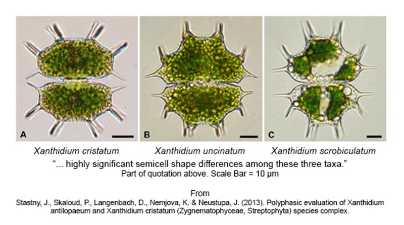 A quote from Stastny et al. (2013: 12): “The molecular data revealed three well-resolved clades within traditional X. cristatum that corresponded to the traditional varieties X. cristatum var. cristatum, X. cristatum var. scrobiculatum, and X. cristatum var. uncinatum. This classification pattern was also confirmed by the geometric morphometric analysis that illustrated highly significant semicell shape differences among these three taxa.”