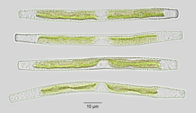 First described and illustrated by Raciborski (1885: 67, pl. 5). It differs from the nominate variety in being less attenuated and the apices are not so capitate or thickened. It is smaller in length than the nominate variety and has small granules instead of spines. Some cells can appear a bit distorted as they undergo division. At least one of the images below show two nuclei. The zygospore is orbicular and smooth-walled, but rarely found.