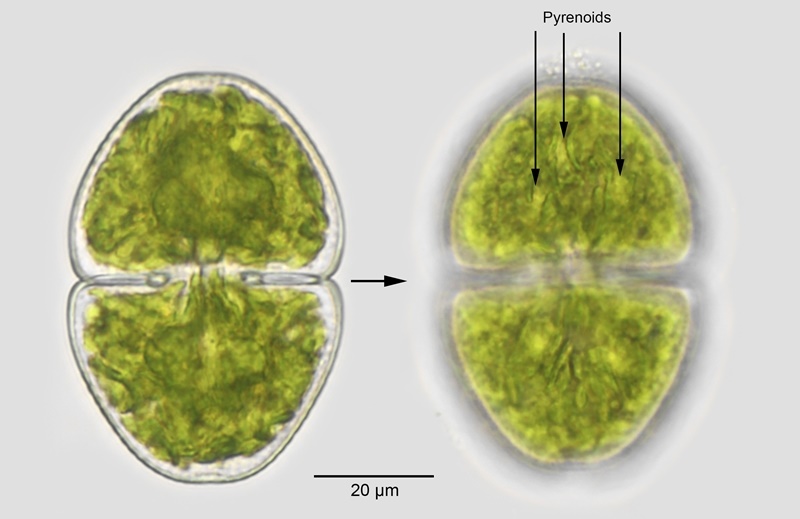Kouwets (1987: 231, pl. 11: 11-12) described a population of pyramid-form cells, which were between C. pyramidatum and C. pseudopyramidatum in size and displayed three pyrenoids in most semicells. Krieger & Gerloff (1965: 121, pl. 25: 3) also described cells with three pyrenoids but with a large size-range suggesting more than one taxon is involved. Surprisingly, his drawing in side-view is remarkably quadrate? The population from the Wind Farm, South Uist was squeezed from Sphagnum and is similar in size to Kouwets' find with perhaps the isthmus measurements slightly broader. The pyrenoids are not always easy to see. Kouwets is proposing to raise this subspecies (his morpha) to species level [Cosmarium pyramidatiforme] but will not be accepted until published.