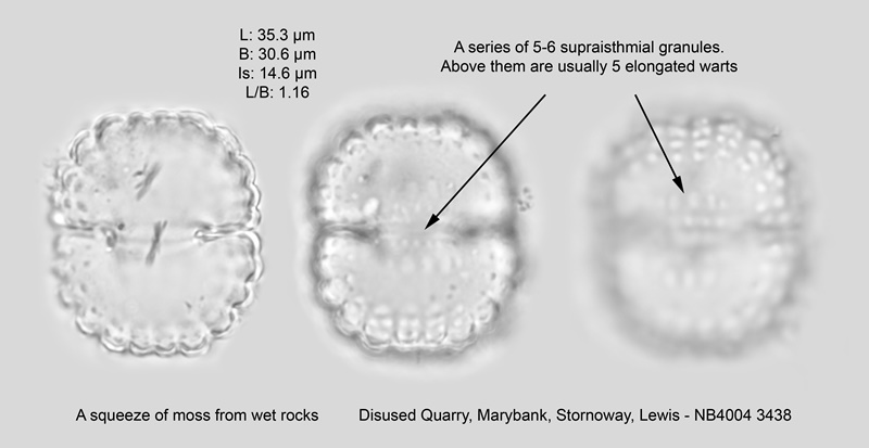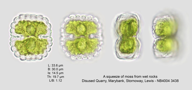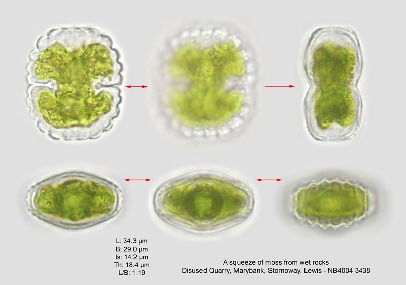 It has much in common with the confused species complex of Cosmarium crenatum Ralfs (1848: p. 96, pl. 15: 7a-c). When Ralfs described this species, he made no mention of central ornamentation. Nordstedt (1872, p. 30, pl. 6: 7) described a number of larger forms with various central ornamentation. The authors decided that these broader forms warranted species status. The central ornamentation can be quite ephemeral and deep focus is often needed to see it. The Stornoway samples show 5-6 supraisthmial granules and up to five elongated warts.