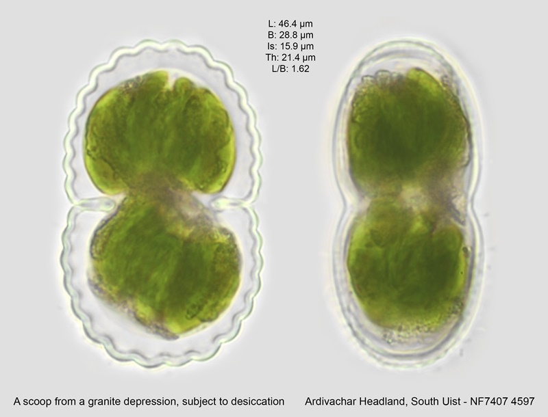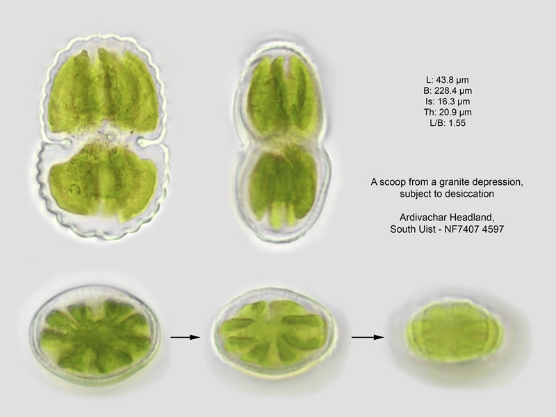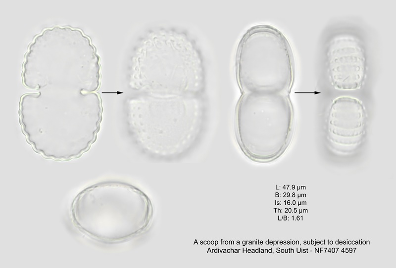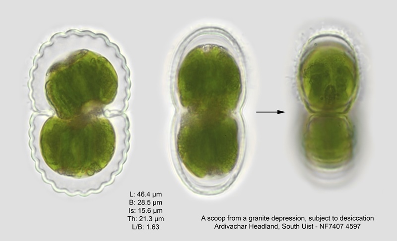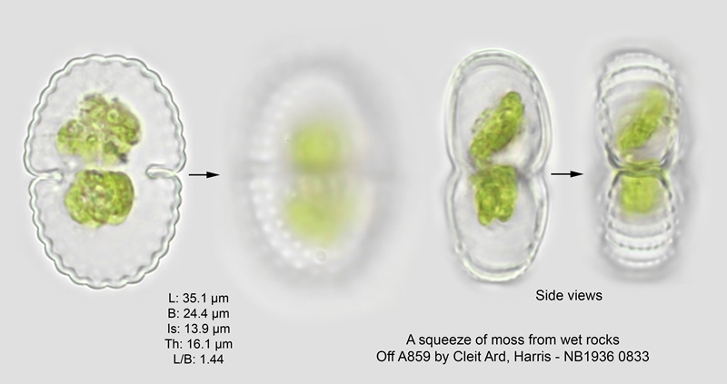 First described by Gutwinski (1890: 67 [emended 1892: 41, pl. 1: 15]). Later, West, W. & West, G.S. (1908: 251, pl. 89: 8-10) made it a variety of C. speciosum suggesting it differs so little that it is scarcely justifiable to regard it as specifically distinct. They give a lower range of sizes as well as taking into account Gutwinski’s measurements and illustrate a cell (l.c. pl. 89: 9) with these small dimensions. Kouwets (in manuscript) refers to this cell and has bracketed the lower sizes suggesting it might represent a different species. Interestingly, The Harris find reflects these lower measurements. A rare desmid found in atmophytic habitats such as ephemeral pools and with moss on wet rocks.