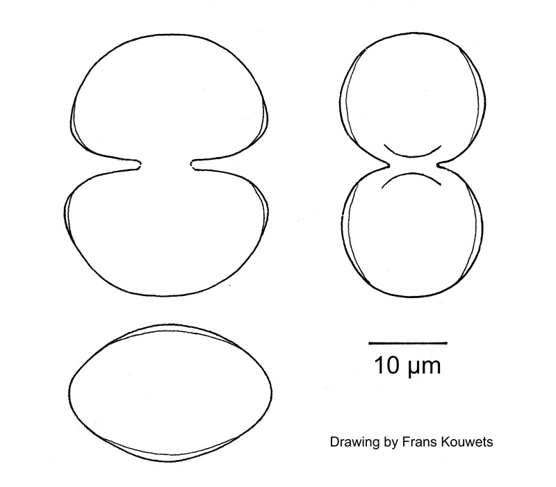 Cells 1.25–1.37 times longer than broad with an acute, open sinus from the start. Semicells somewhat variable in outline, in frontal view broadly trapeziform with the lower lateral angle straight to marginally convex running smoothly into rounded lateral angles, the broadest part of the semicell about one third up from the isthmus. Upper laterals are slightly convex running smoothly into the apex which is also slightly convex. The cell wall is quite thick and uniformly and densely punctate (mucus pores). There is noticeable cell-wall thickening at the widest points and, less so, at the apex. In side view the semicells are orbicular with a lenticular wall thickening. The apical view is broadly ellipsoid with rather narrowly rounded poles and a considerable, broad wall thickening on either frontal side. Chloroplast axile with a single large pyrenoid per semicell. Zygospore unknown.