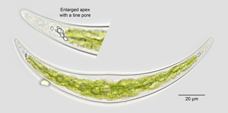 Single cell dimensions: L: 147 µm; B: 21.3 µm; Ap: 2.7 µm; Arc: 140°; L/B: 7.