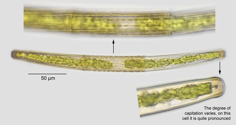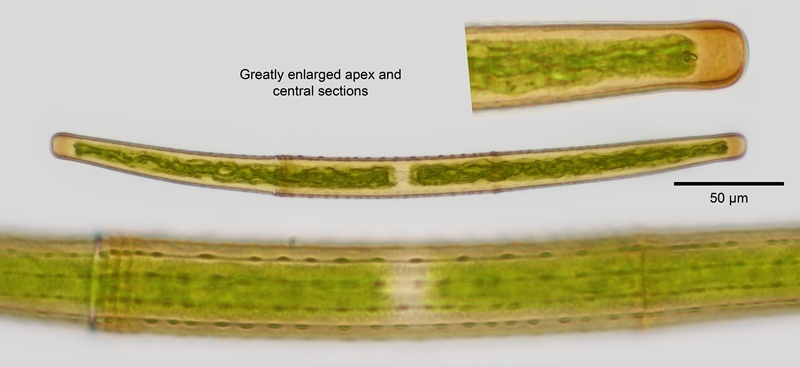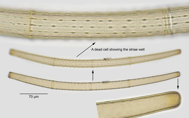 Cell dimensions: L: 230-416 µm; B: 10-22 µm; Ap: 6.5-13.5 µm; L/B: 16-23.