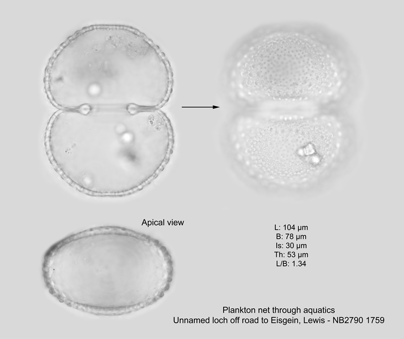 This variety differs from the nominate in the less well developed central swelling and with slightly smaller dimensions. In the cell found from Lewis, the central portion is little more than cell-wall thickening. See Couté & Tell (1981, p. 86, pl. 24: 1-6) for SEM images. A rare taxon found in oligo-mesotrophic waters.